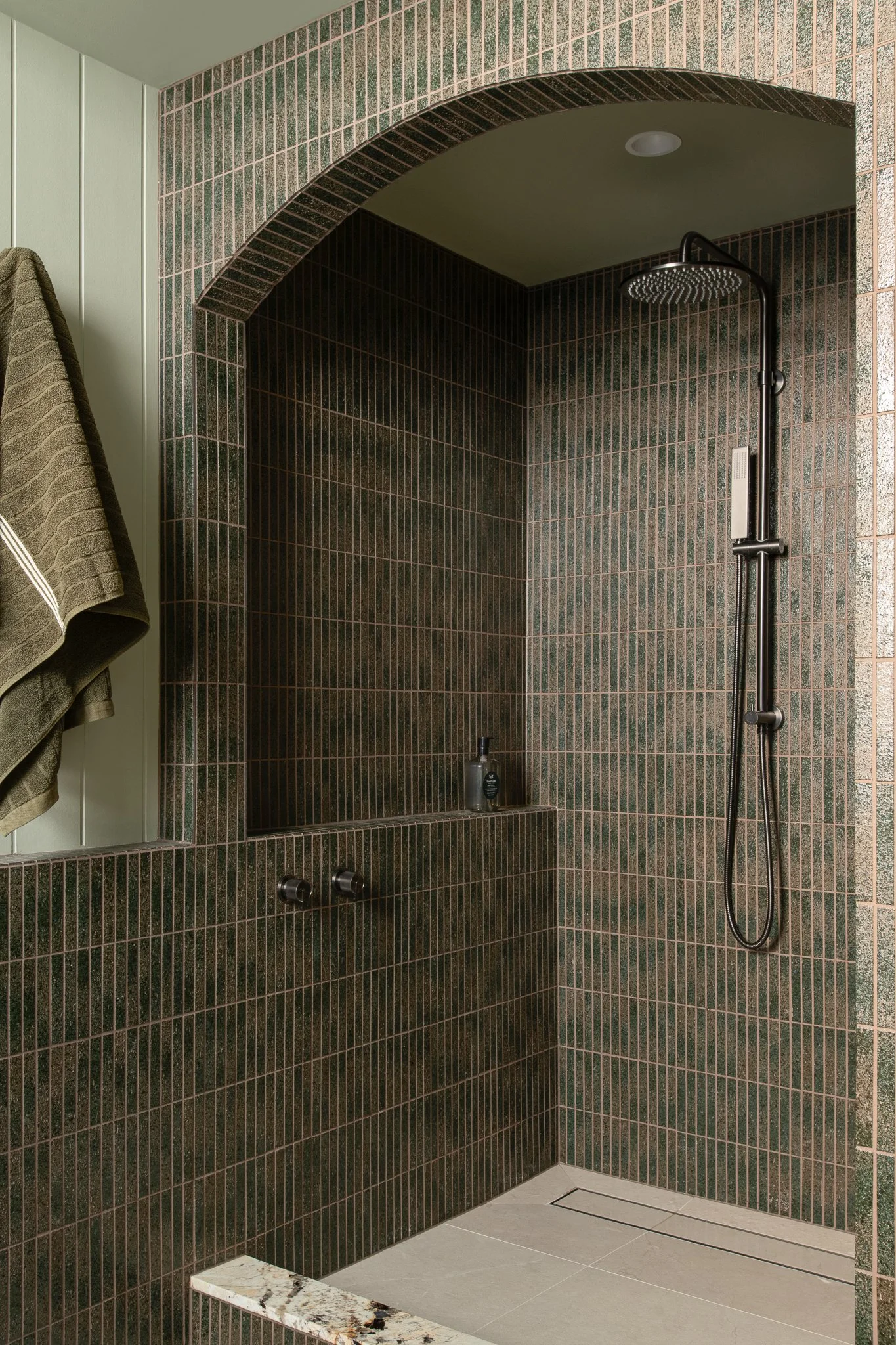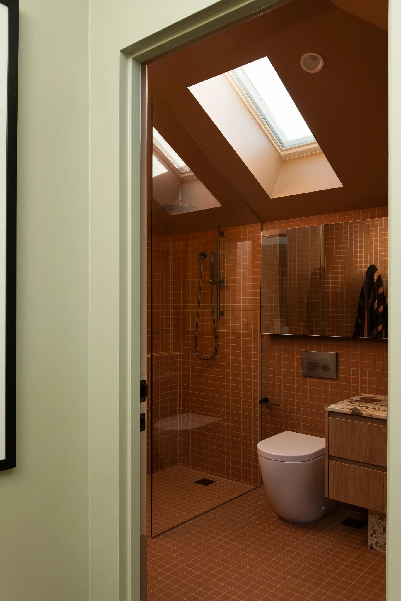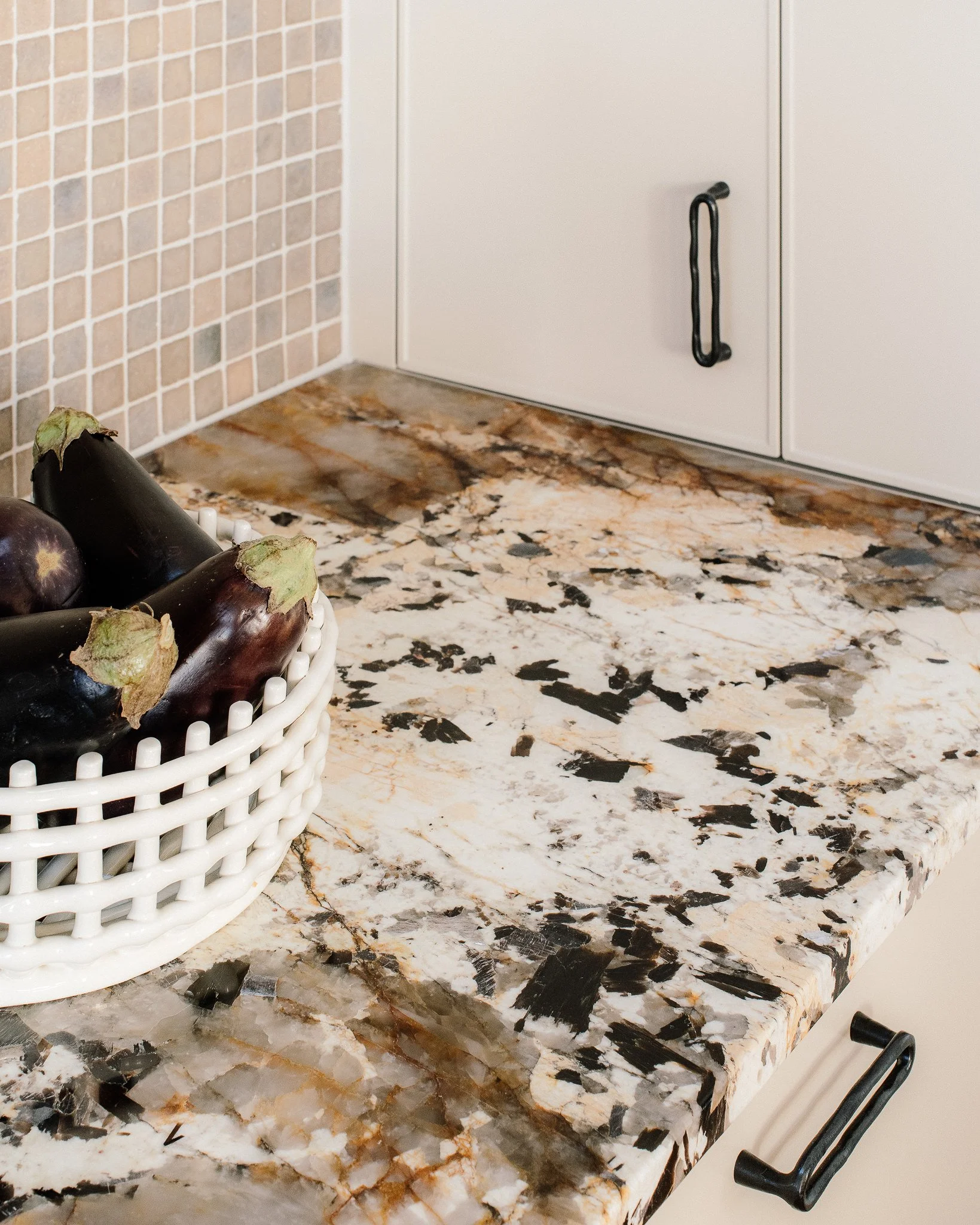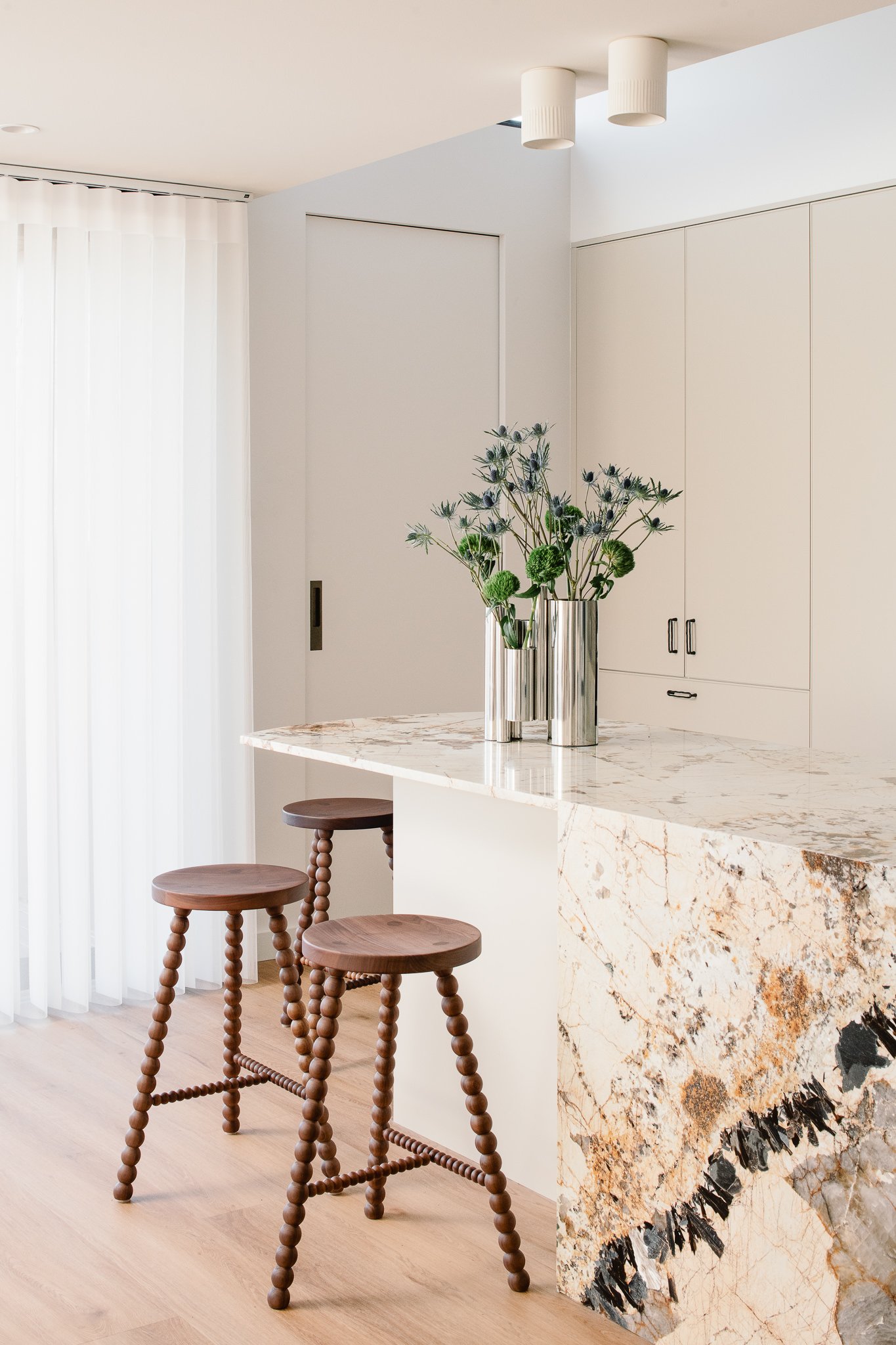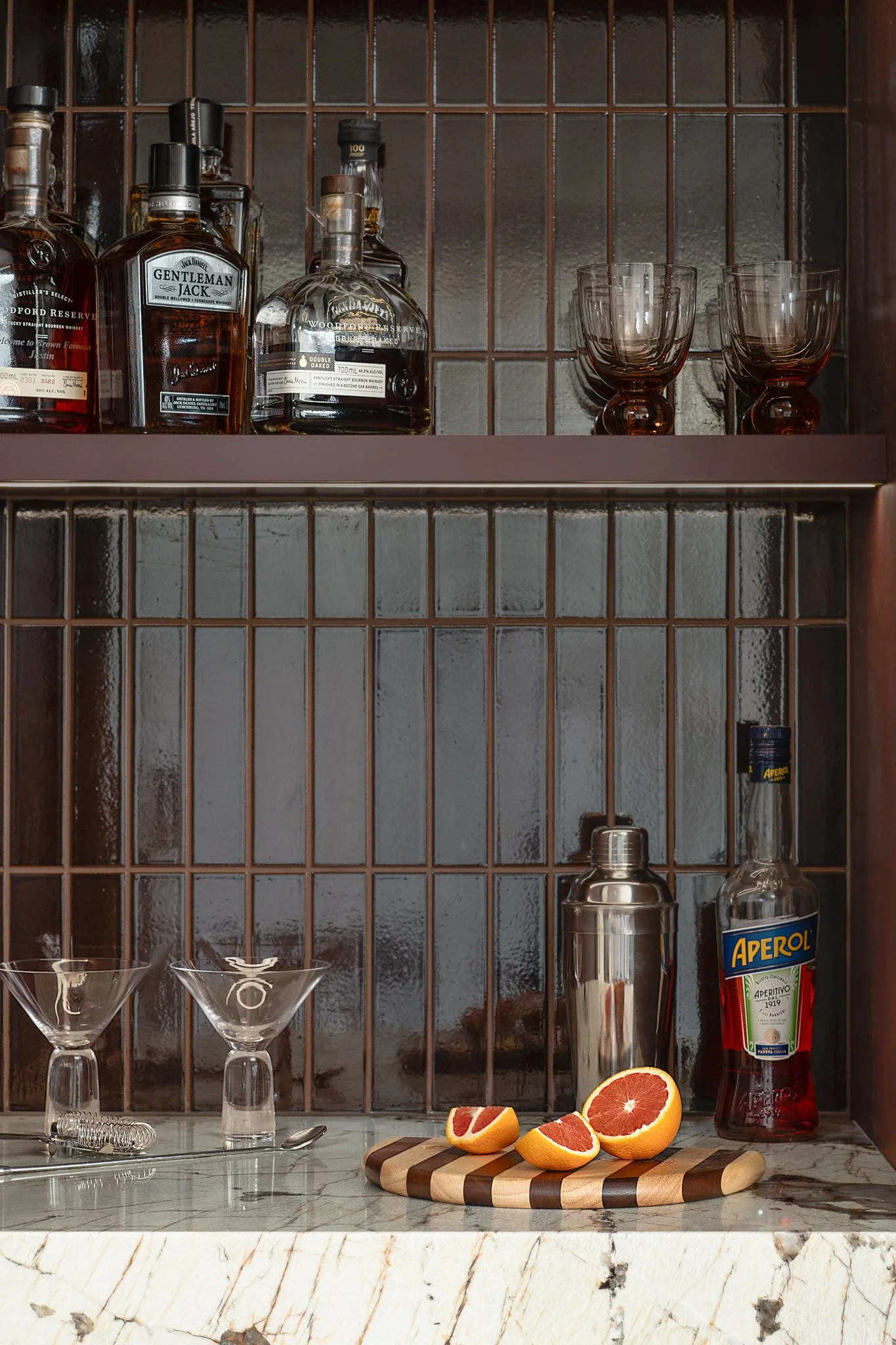 Throughout the home, moments of surprise are balanced with thoughtful functionality, from richly coloured joinery and mosaic tiling to sculptural stone surfaces and playful bathroom palettes. The kitchen becomes a central social hub, anchored by a striking stone island, while integrated bar storage reinforces the home’s entertaining spirit and gives the project its name.